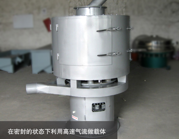 氣流篩粉機是在,傳統的重力勢能的作業原理的基礎上開辟了利用流動體的篩分特性,其主要工作原理是在密封的狀態下利用高速氣流做載體,使充分擴散的粉料微粒以足夠大的動能向篩網噴射 , 達到快速分級之目的。微細粉物料經進料斗流人進料斗口,立即擴散并與空氣混合成霧狀, 經旋轉風輪的作用,呈旋風狀噴射過網,在引風機的作用下,氣體與細粉全部進人沉降室,成品細粉沉降后由下部排出 , 帶有少量粉塵的氣體進人除塵布袋 ,經凈化后排出袋外。顆粒直徑大于網孔的物料不能過網,落人篩盤內由排渣口排出機外。