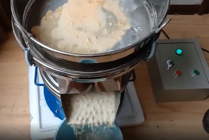 過濾篩工作時,物料從進料口進入篩機內,由重錘帶動振動,在篩網上做水平、垂直、傾斜的三維運動,在篩網上拋起并由中心向外旋轉至出料口排出。