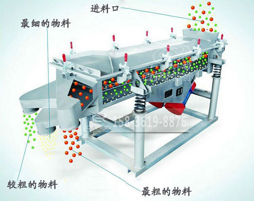 多層直線振動(dòng)篩粉機(jī)為雙振動(dòng)電機(jī)驅(qū)動(dòng)。當(dāng)兩臺(tái)振動(dòng)電機(jī)做同步、反向旋轉(zhuǎn)時(shí),其偏心塊所產(chǎn)生的激振力在平行于電機(jī)軸線的方向相互抵消,在垂直于電機(jī)軸的方向疊為一合力,因此篩機(jī)的運(yùn)動(dòng)軌跡為一直線。兩電機(jī)軸相對(duì)篩面在垂直方向有一傾角,在激振力和物料自重力的合力作用下,物料在篩面上被拋起跳躍或向前作直線運(yùn)動(dòng),從而達(dá)到對(duì)物料進(jìn)行篩選和分級(jí)的目的。適用于粒度在0.074—5mm,含水量小于7%,無(wú)粘性的各種干式粉狀或顆粒狀物料的篩分。大給料粒度不大于10mm。物料從給料機(jī)均勻地進(jìn)入篩分機(jī)的進(jìn)料口,在振動(dòng)電機(jī)的激振下,向出料口方向邊跳動(dòng)邊篩分,通過(guò)多層篩網(wǎng)篩分出數(shù)種產(chǎn)品和不合格的篩上、篩下物,分別從各自的出口排出,流入料倉(cāng)或盛料筒。
